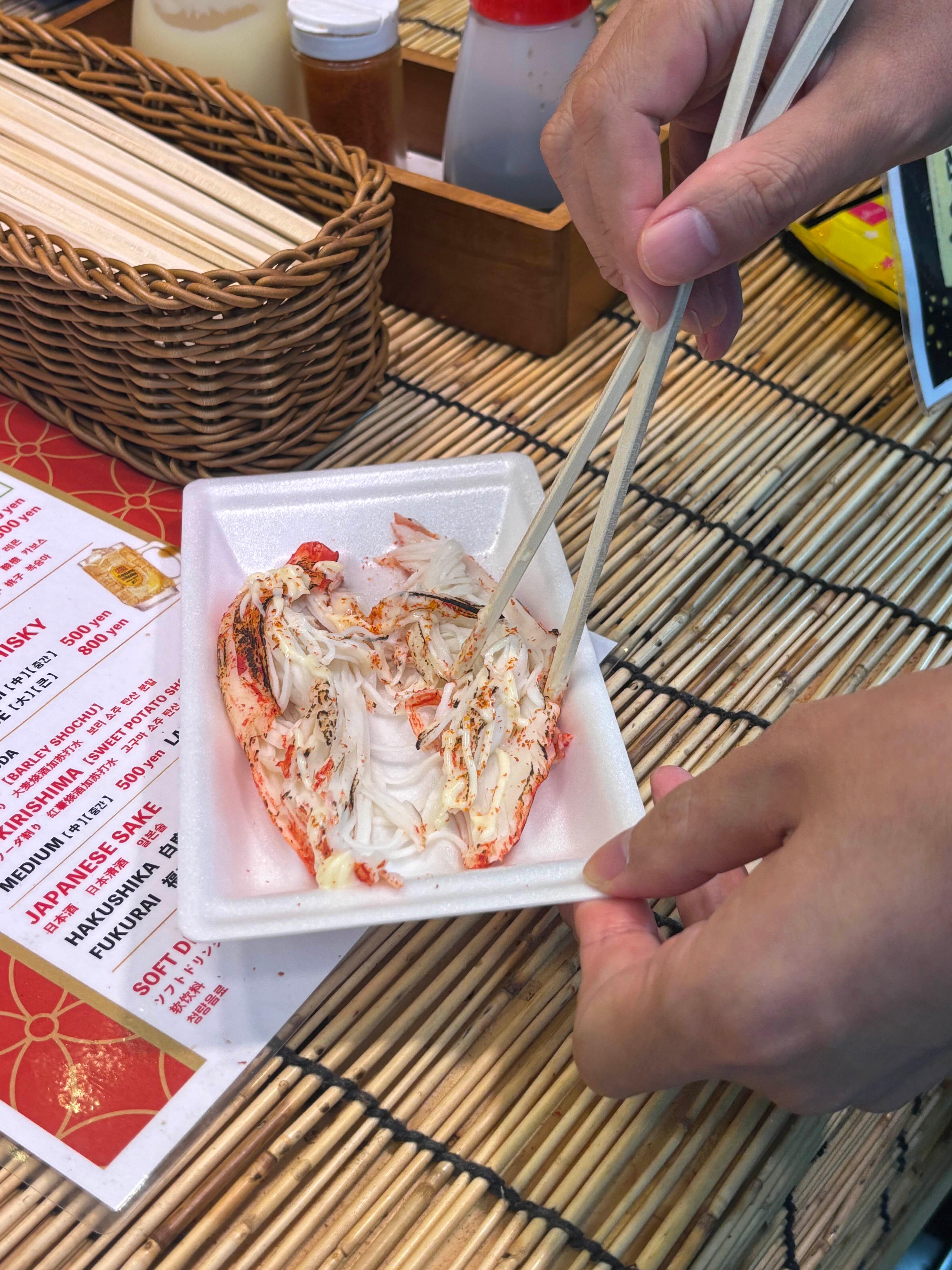 그 다음은 걸어가다 길 건너 편에서 발견한 대왕게맛살 구이 가게. 게살 구이 말고도 다양한 해산물, 특히 새우 같은거? 놓고 팔고 있었고, 내 기억이 맞다면 잔술도 같이 팔았던 것 같음. 일단 가게 외관이 너무 들어가보고 싶게 생기기도 했고, 부담없이 츄라이 할 수 있는 메뉴니까 무조건 고고. 직원분이 어느정도 한국말을 알아듣고 소통해주시는 친절한 분이었다. 게살구이에다가 마요네즈랑 고춧가루 양념 같은거 매운거까지 같이 뿌려야 맛있다고 추천해주셨고 진짜 맛있었음 ㅋㅋㅋ