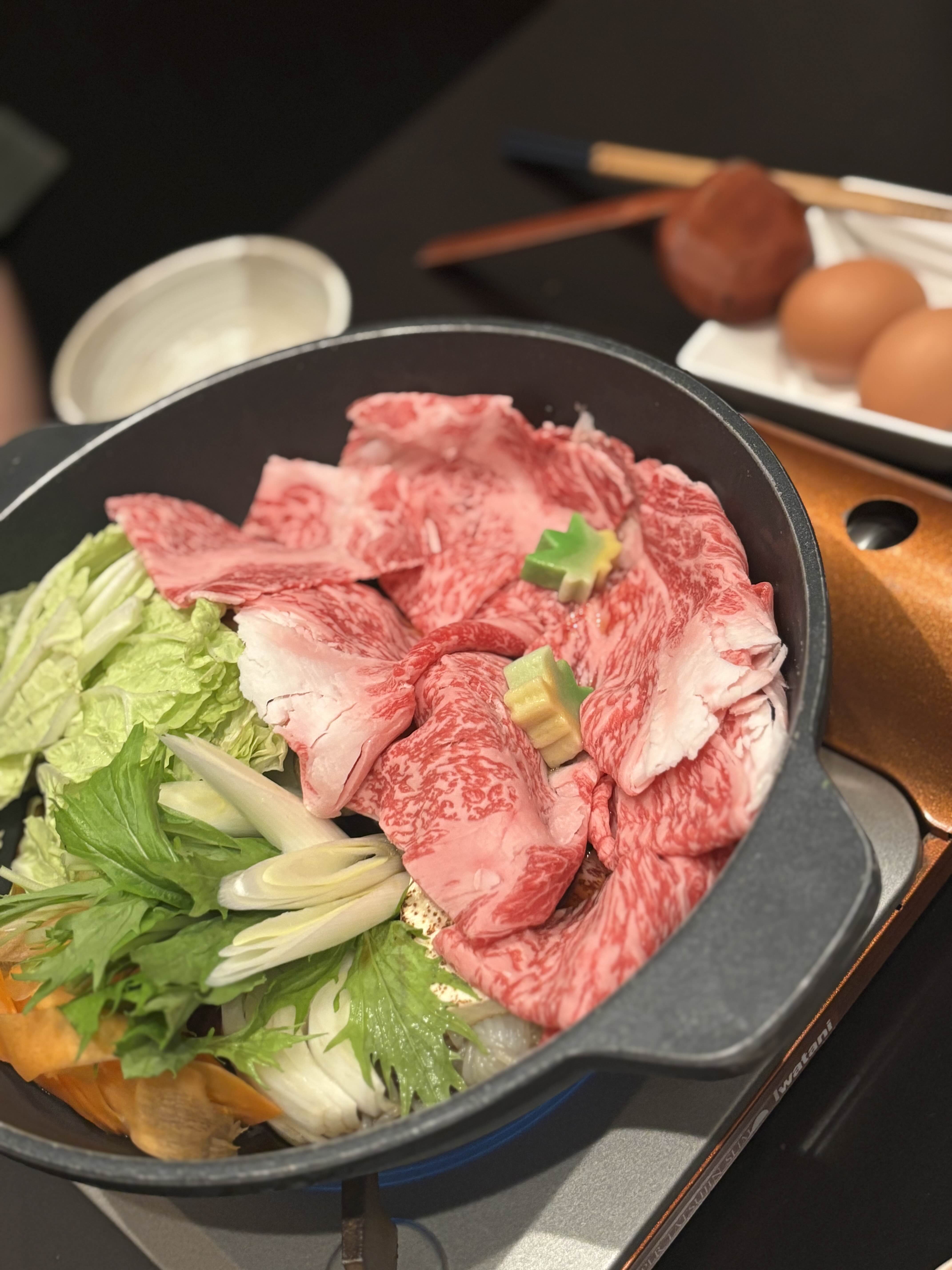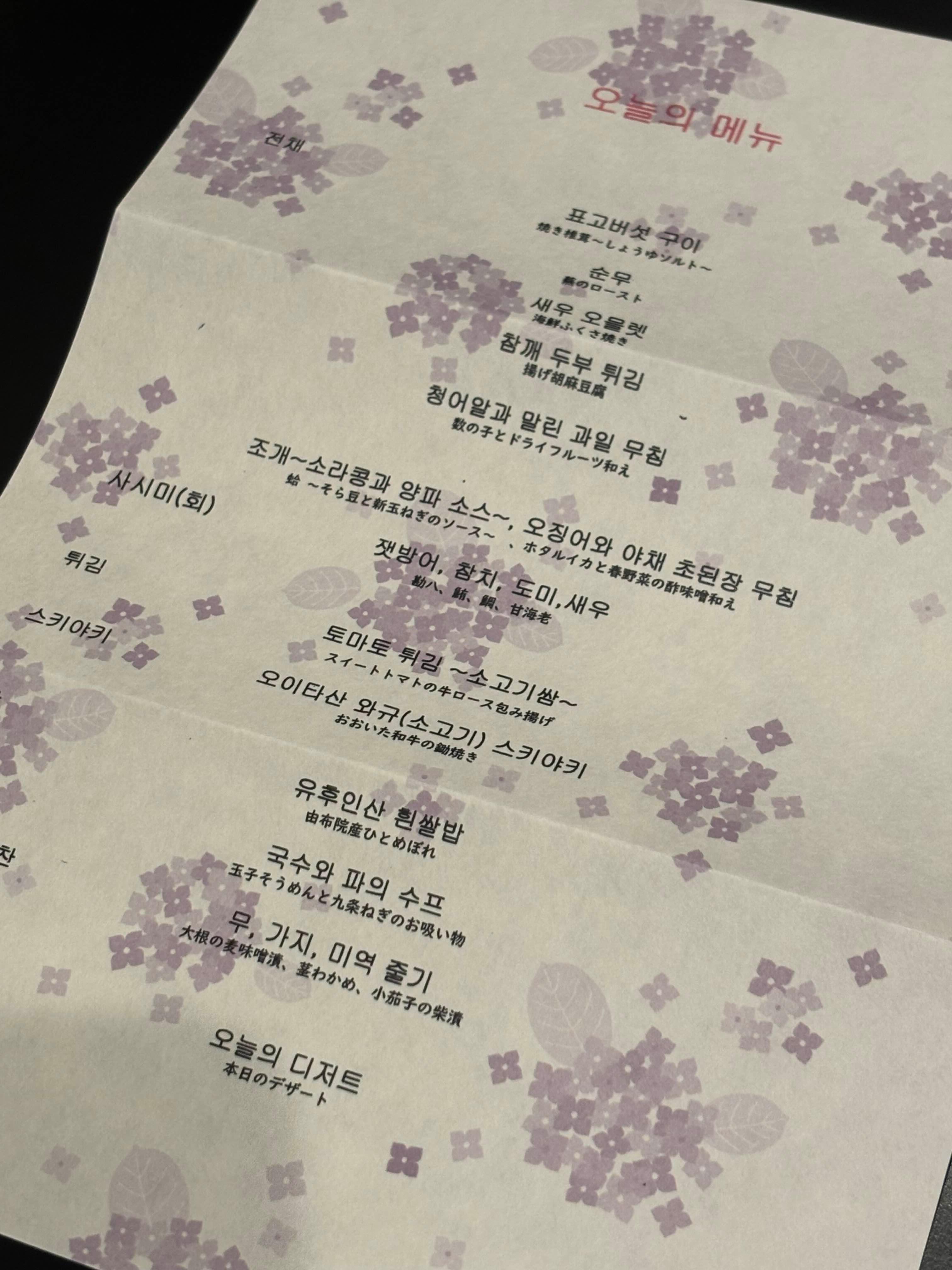 음식은 솔직히 그냥 그랬습니다. 옛날에 친구들이랑 후쿠오카 하카타역에서 먹은 스키야끼가 진짜 맛있었는데… 여기는 뭔가 좀 더 오목한 냄비에 고기를 통째로 다 담그고 끓여먹는 식이라서 국물이 흥건한 느낌이랄까… 내가 생각한 자작자작한 낮은 냄비에 고기를 졸여 먹는 그런 스타일이 아니었음. 그래도 유후인 쌀로 만든 쌀밥은 ㅋㅋㅋ 인상적이었다. 그리고 사시미도 신선하고, 거품 크림을 낸 조개 요리도 맛있긴 했음.